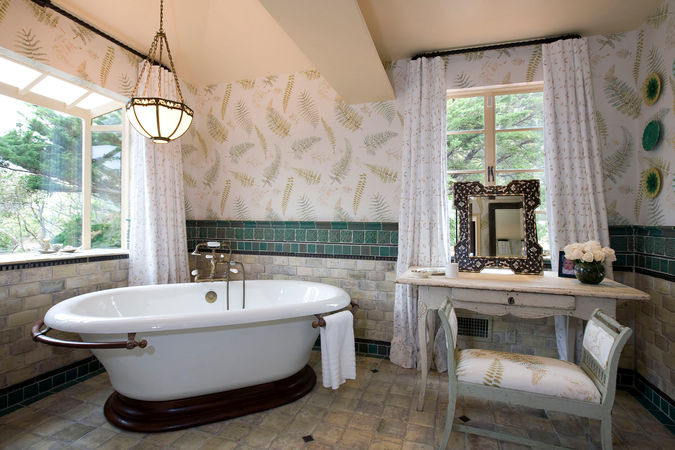 Set high on a knoll with sweeping views of the Pacific, this 1930s Malibu home is a warm and romantic retreat. Golden-toned plaster walls and mature cypress trees create an aged, timeless presence. Inside, soft light filters through sheer curtains, rustic details mix with coastal charm, and antique touches add depth and character. The living spaces feel cozy yet elegant, while the primary bedroom—complete with fireplace and ocean views—offers a peaceful escape steeped in comfort and history.